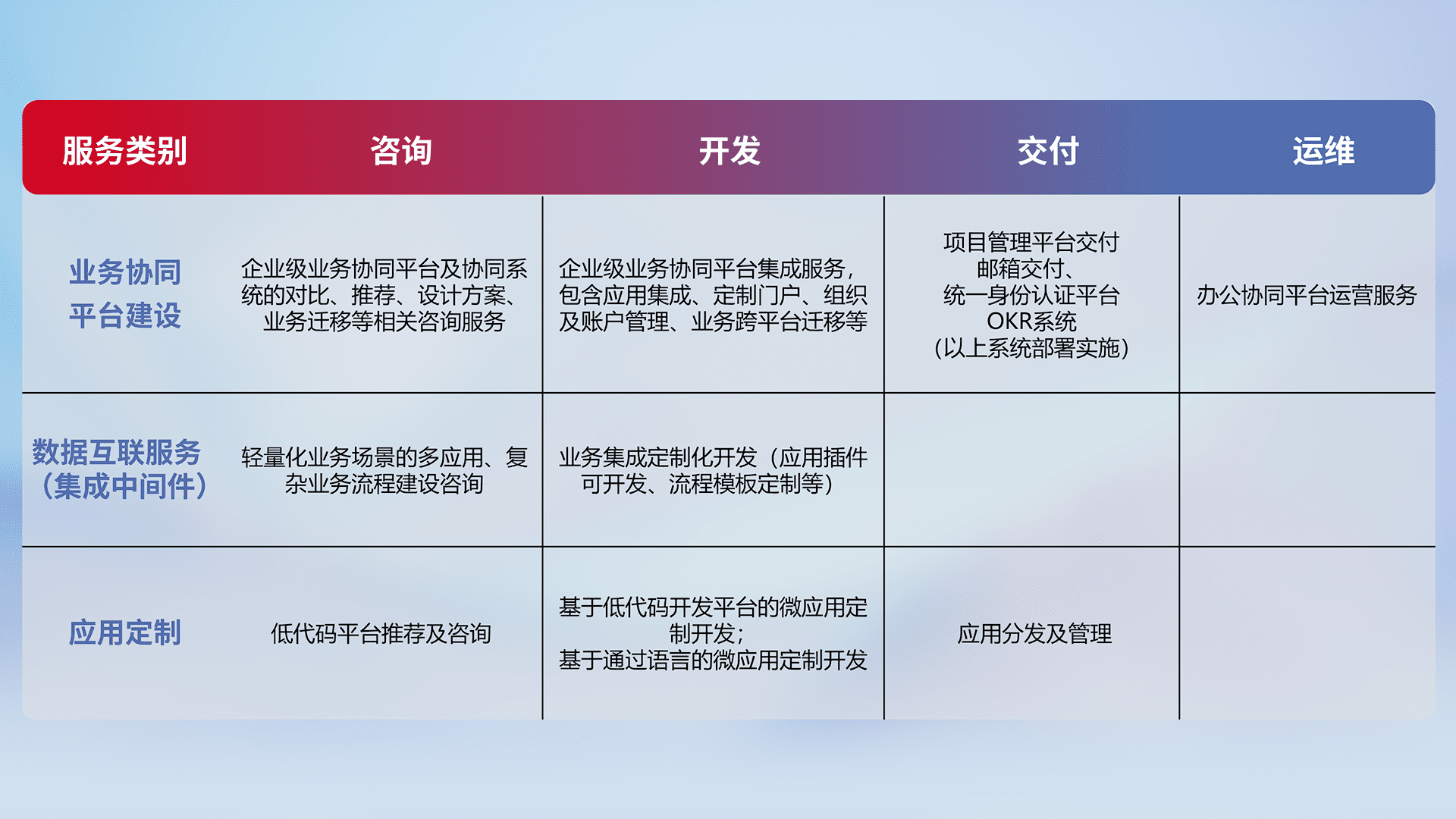 针对钉钉、、、、企微、、IDaas等平台级产品提供产品的规划、、、方案、、、、交付、、定制化开发等服务,,实现如统一协同办公、、智能客户服务、、、混合会议管理、、、智能数据查询、、、、等业务场景,,实现数字化转型。。。